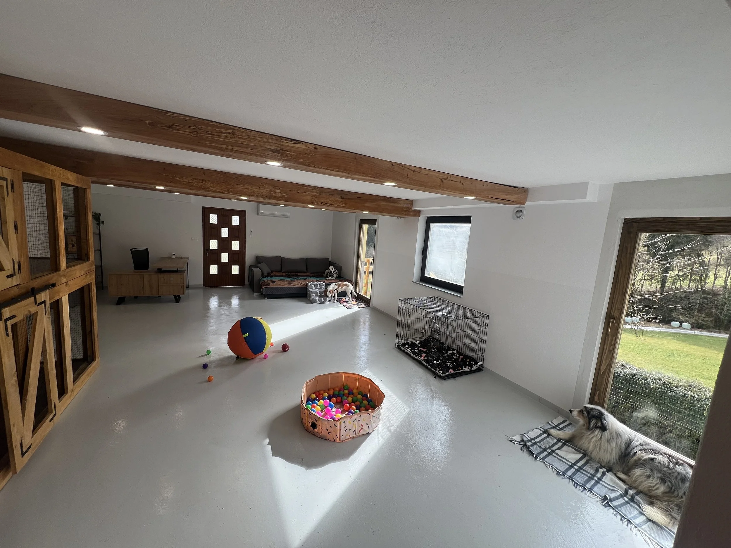 Psi večino časa preživijo spuščeni v skupnem bivalnem prostoru, kjer se lahko igrajo, počivajo in družijo. Iz notranjega bivalnega prostora imajo tudi neposreden dostop do varno ograjenega zunanjega prostora, kjer se lahko gibajo, raziskujejo in uživajo na svežem zraku. Boksi se uporabljajo le po potrebi – za počitek, hranjenje ali kadar pes potrebuje mir.